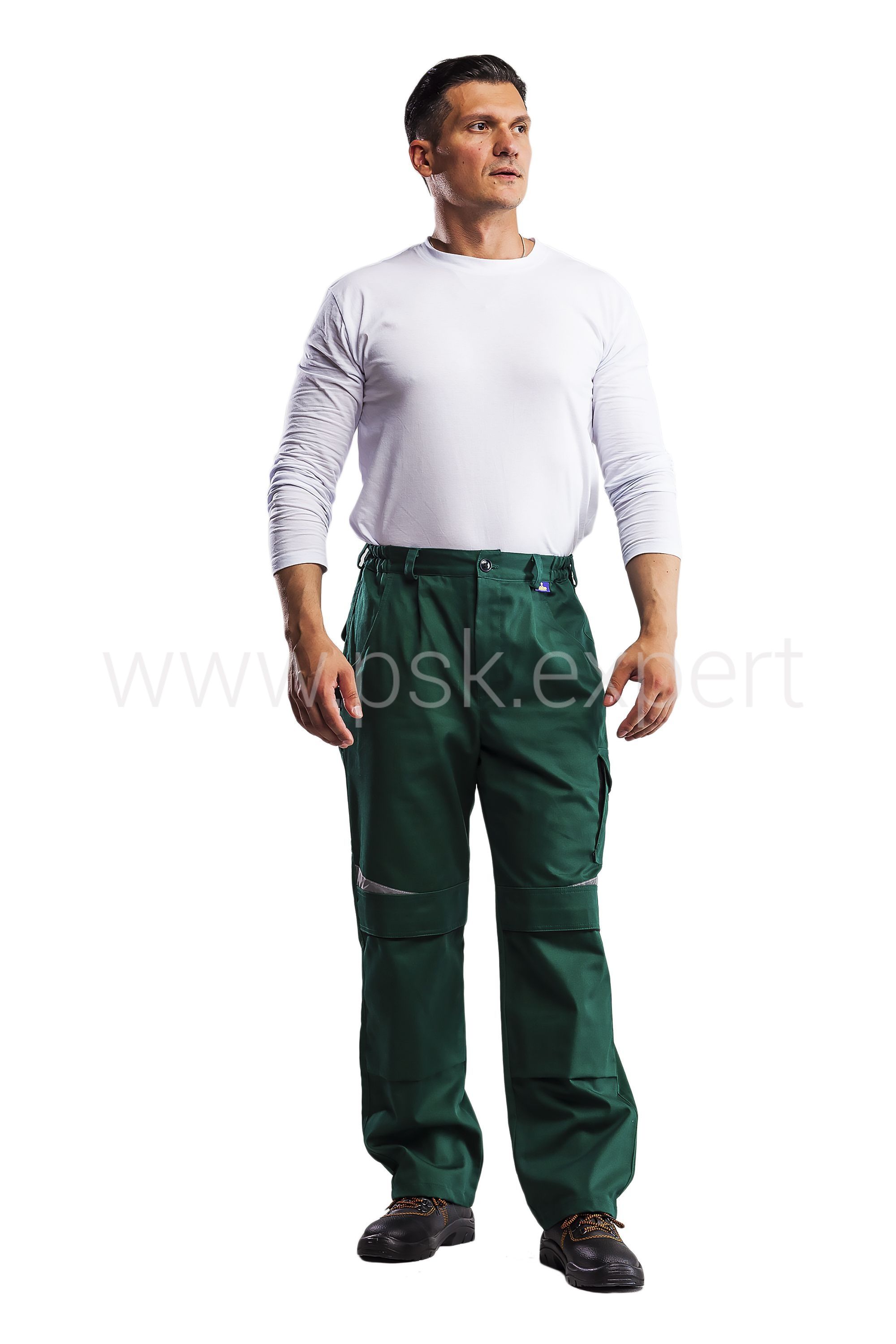 Брюки с наколенниками-карманами для амортизационных вкладок. Пояс со шлевками для ремня и эластичной тесьмой. Центральная застежка на молнию и пуговицу. Функциональные боковые и задний карманы. На задней части брюк один дополнительный удлиненный карман с держателем для инструментов. Фигурные элементы в области колен из светоотражающего материала.