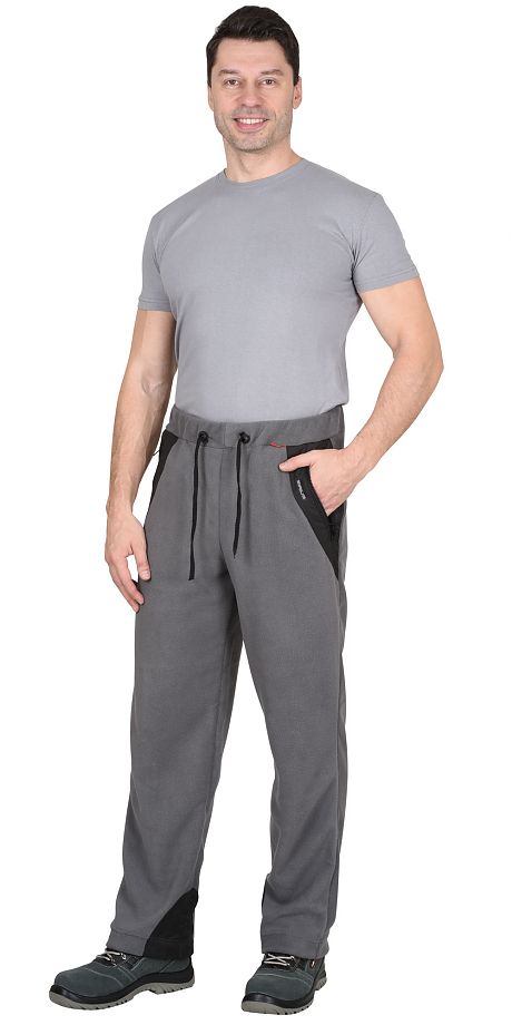 Ткань верха: "флис"; плотность 260 г/кв.м.; состав: 100% п/э.Отделочная ткань: " Дюспо" пл. 75г/м2 ; 100% п\э ; Брюки прямого покроя; с притачным поясом стянутым эластичной тесьмой и шнуром с фиксаторами, с боковыми вертикальными карманами, застегивающимися на тесьму-"молния". На брюках располагаются декоративные вставки из ткани Дюспо, сверху в области бокового шва и снизу по шаговому шву. ГОСТ 25295-2003
