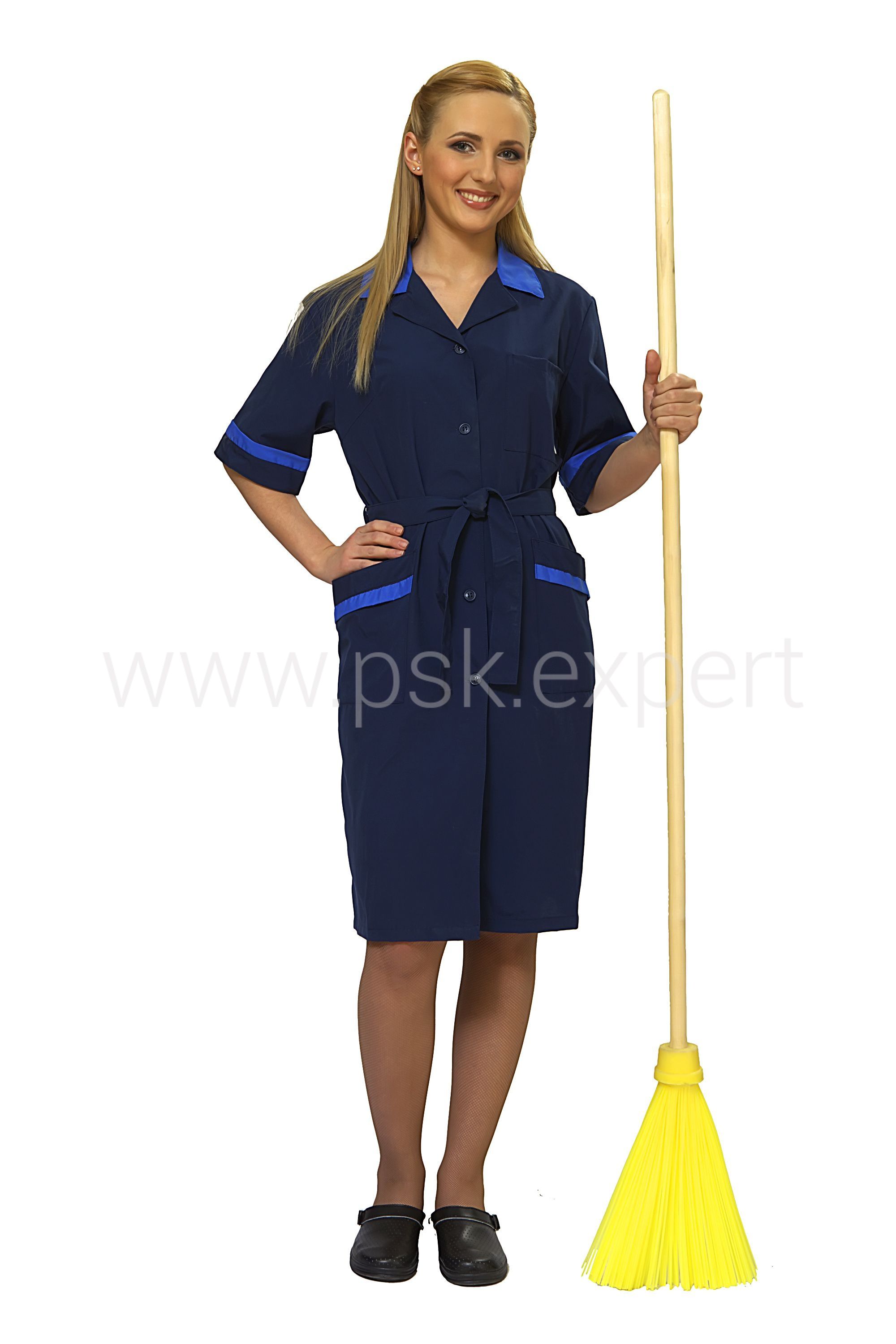 Халат полуприлегающего силуэта с центральной застежкой на пуговицы, отложным воротником, с накладными и нагрудным карманами, рукав - короткий, объем по талии регулируется поясом. Воротник, рукава и карманы с отделочными деталями из контрастной ткани.