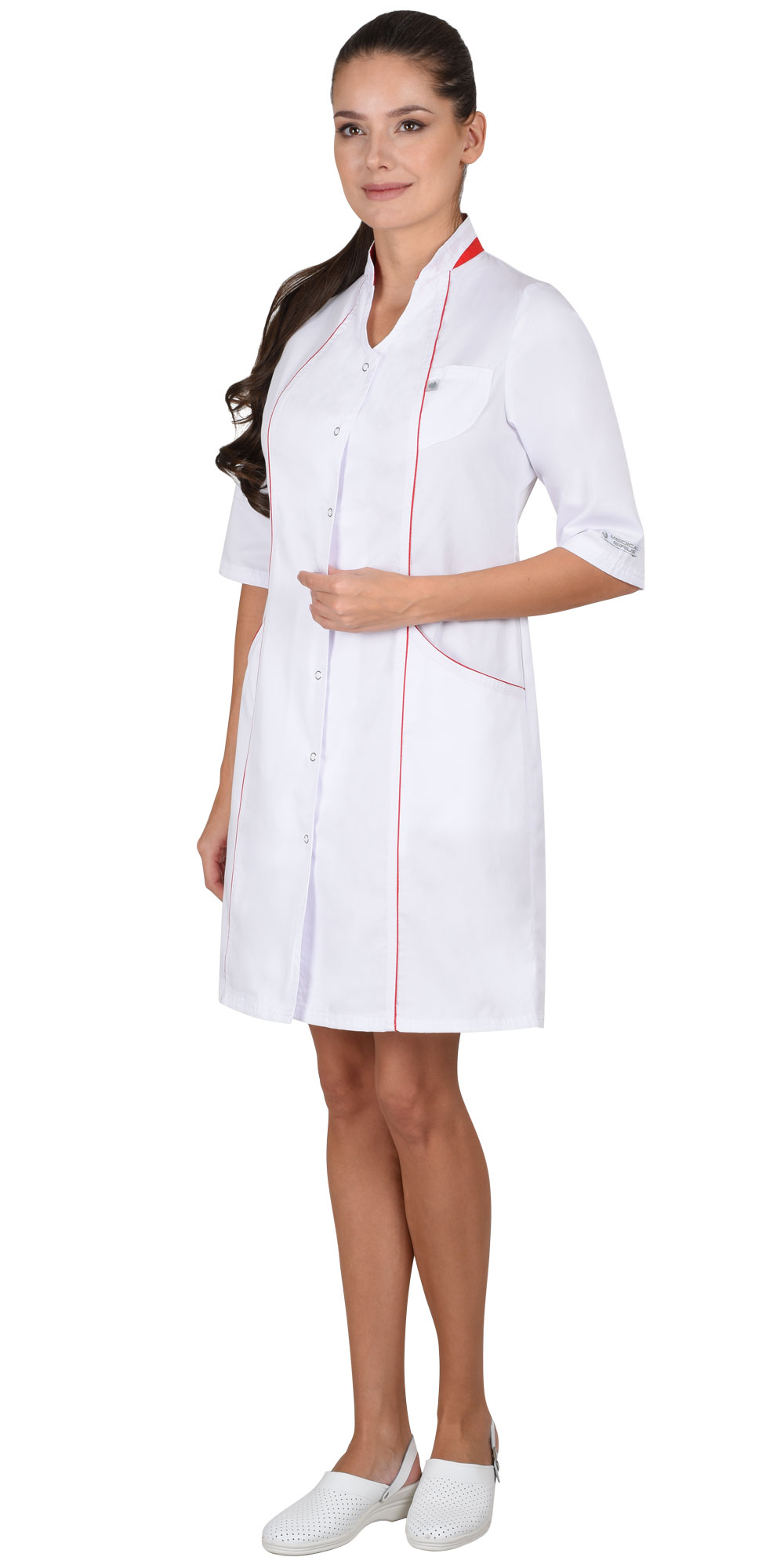 Халат полуприлигающего силуэта, с центральной застежкой на кнопки с верхними и нижними фугурными карманами. Воротник-стойка, в рельефных швах халата отделочный кант. Рукава 3/4.