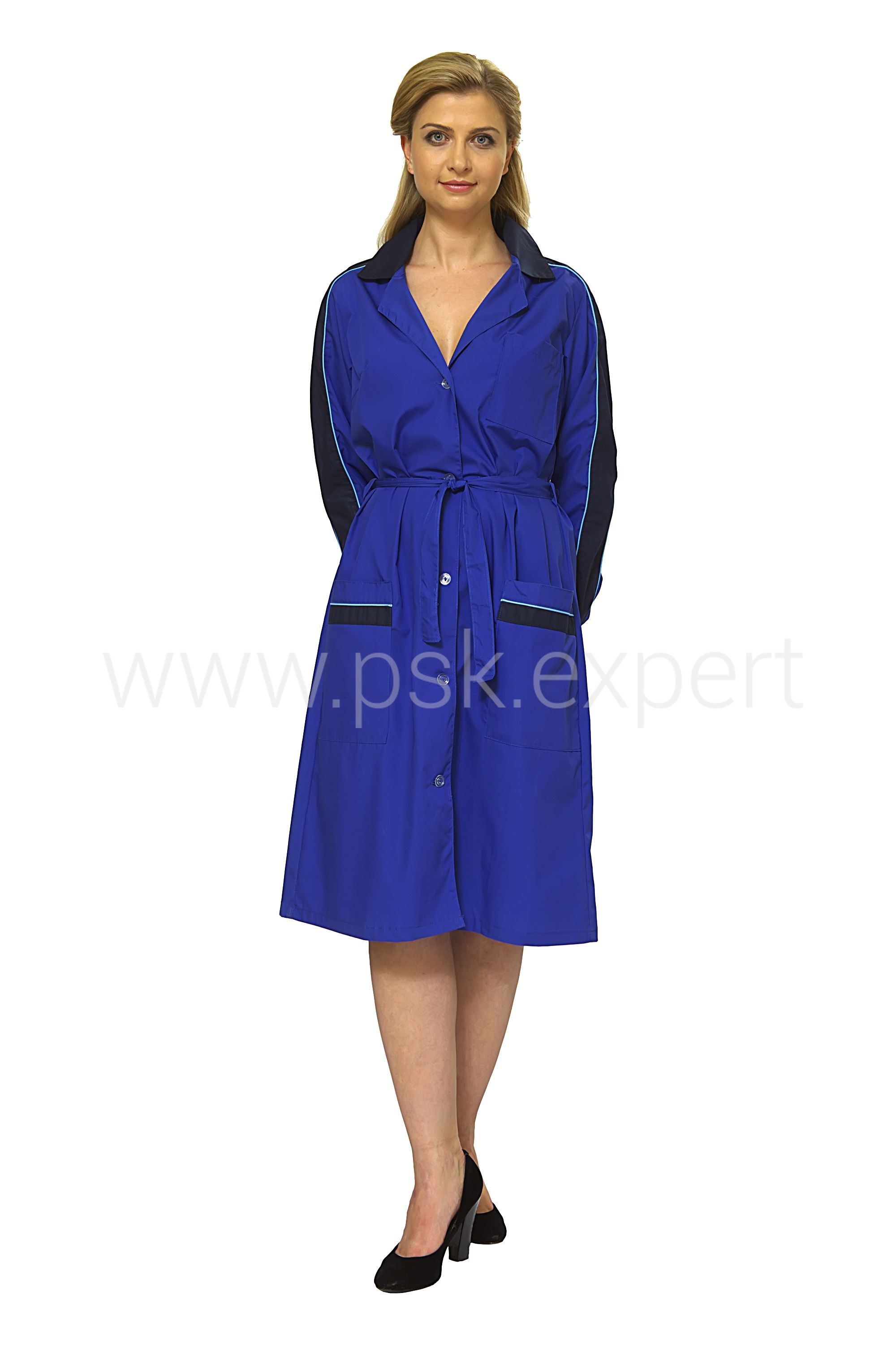 Халат полуприлегающего силуэта с центральной застежкой на пуговицы, отложным воротником, с накладными и нагрудным карманами, рукав - длинный, объем по талии регулируется поясом. Воротник, рукава и карманы с отделочными деталями из контрастной ткани.
