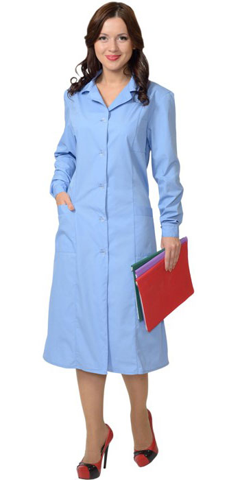 Классическая модель с нагрудным и двумя нижними накладными карманами, отложным воротником и длинными рукавами с манжетами. Ширина халата по линии талии регулируется хлястиком.