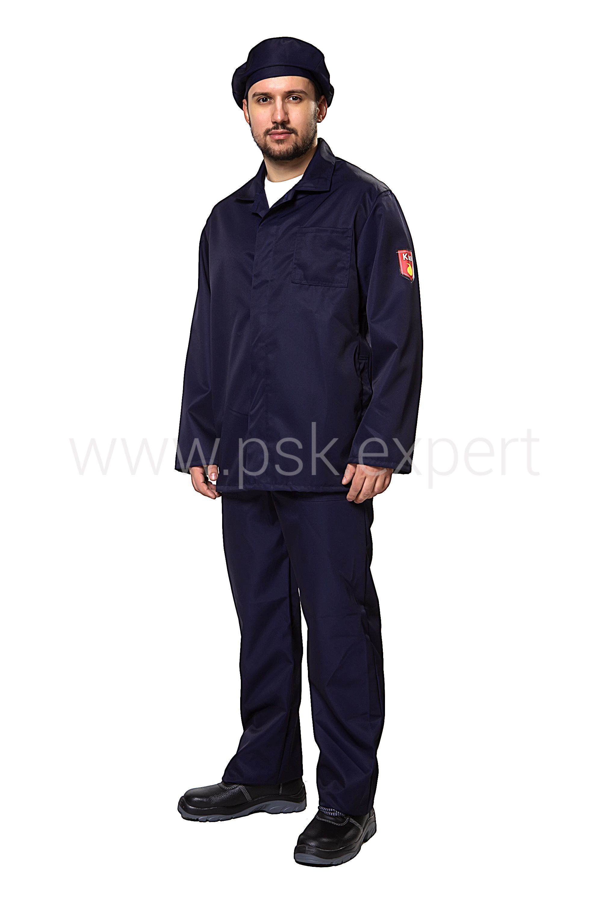 Костюм – куртка, брюки и берет. Куртка с центральной супатной застежкой на пуговицы, карманами в рельефных швах. Брюки свободного прямого покроя. Плотный берет выполняет защитные функции головы от вредных сред. Костюм предназначен для защиты от растворов кислот с концентрацией до 80%.