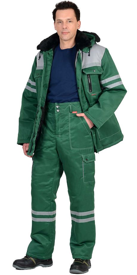 Куртка с притачной утеплённой подкладкой, с отстёгивающимся капюшоном, центральной застёжкой-молнией, скрытой под ветрозащитной планкой, меховым отложным воротником, кулисой по талии стянутой шнуром. Трикотажные манжеты рукавов защищают от проникновения холода. Брюки прямые с притачной утепленной подкладкой, с широким притачным поясом, с застежкой гульфика на тесьму – «молния», с накладными боковыми карманами, с задними накладным фигурным карманом, накладными полуобъмными карманами с фигурными клапанами. В Куртке и брюках предусмотрены СОП шириной 25мм для обеспечения сигнальной видимости в условиях пониженной видимости.