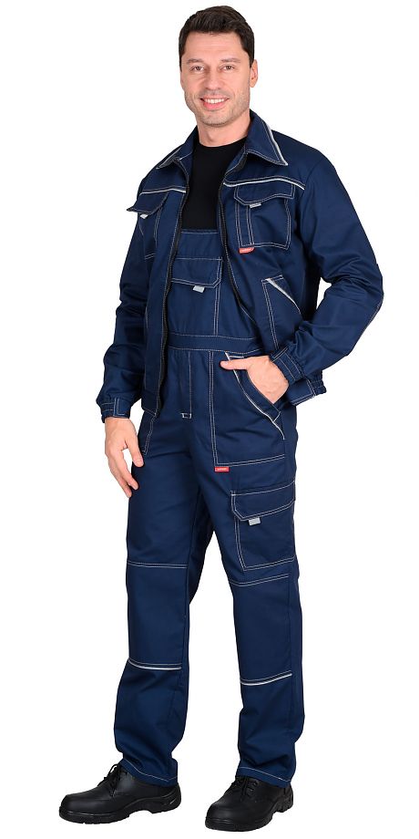 Костюм состоит из куртки и полукомбинезона.Куртка укороченная, прямого силуэта, с отложным воротником, с центральной застёжкой на тесьму "молнию", с притачным поясом с эластичной лентой по боковым швам, с накладными верхними и нижними карманами, рукава с манжетами и с налокотниками.Полукомбинезон с застёжкой гульфика на тесьму "молния", застёжкой в правом боковом шве на 3-и петли и пуговицы, отрезной грудкой, верхним и нижними боковыми карманами, с наколенниками, с эластичной лентой по спинке. Ткань верха: "Родос" 65% п/э, 35% х/б, поверхностная плотность 240 г/м2. Цвет: темно синий