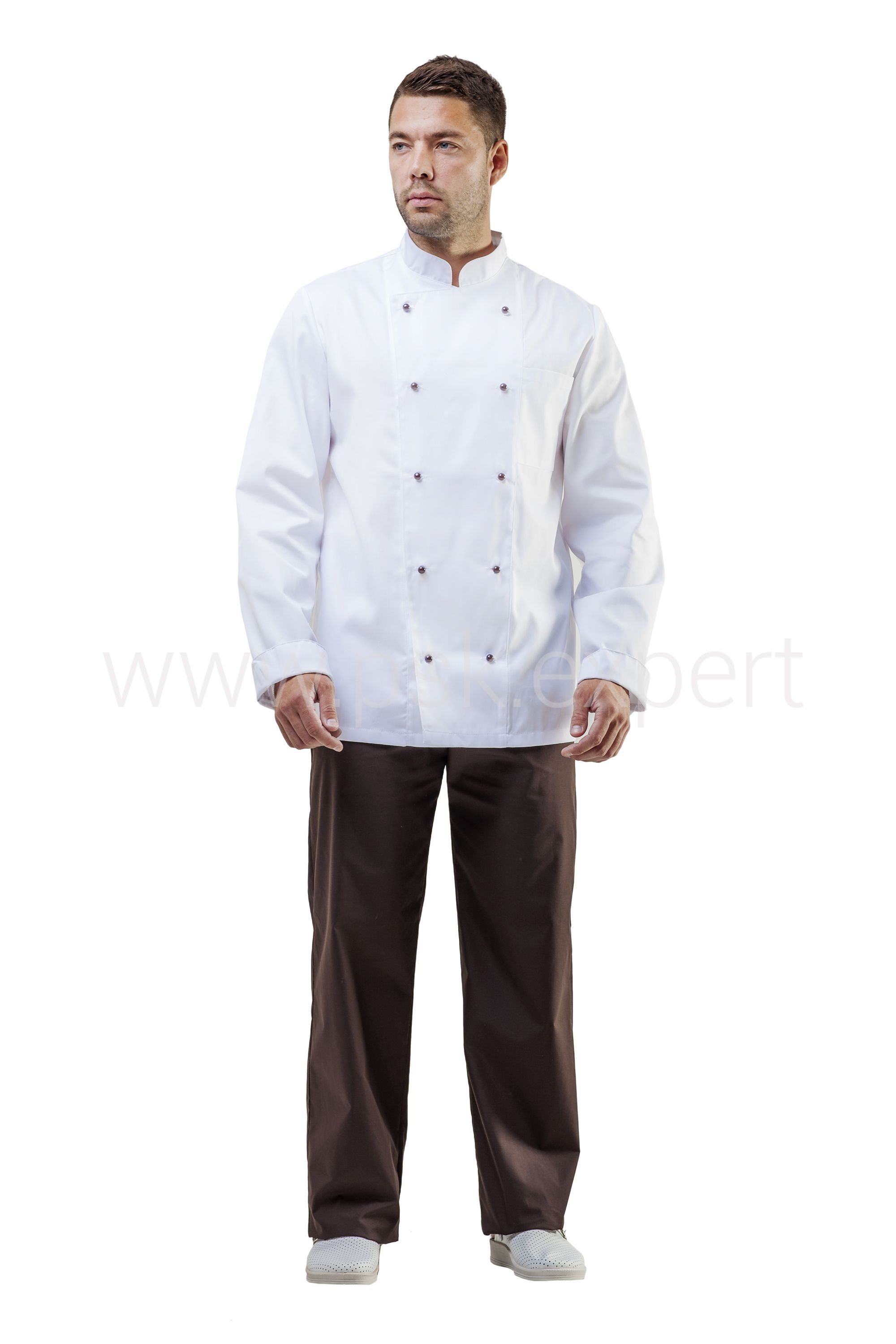 Куртка двубортная, с застежкой на пукли контрастного цвета, воротник-стойка. Брюки свободного покроя, из контрастной ткани, объем по талии регулируется эластичной тесьмой. В комплект входит косынка в цвет брюк.