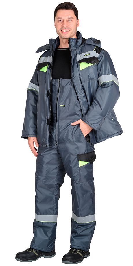 Костюм состоит из куртки и полукомбинезона.Куртка прямого силуэта, длинная, с притачной утепленной подкладкой, воротник стойка, с пристегивающимся утепленным капюшоном, с центральной застежкой на молнию накрытую ветрозащитным клапаном, застегивающимся на кнопки и липучки, подрезными бочками, верхними фигурными карманами с фигурными клапанами на кнопках, нижними карманами в швах, регулировкой низа куртки. Рукава с внутренними трикотажными манжетами и регулировкой ширины при помощи хлястиков и липучек. В куртке предусмотрен СОП шириной 50мм для обеспечения сигнальной видимости в условиях пониженной видимости.Полукомбинезон прямого покроя, с притачной утепленной подкладкой, с притачным нагрудником, с центральной застежкой на молния, с накладными карманами на нагруднике, с регулируемыми за счет фастексов бретелями, с внутренними боковыми карманами, с наколенниками, накладным карманом на левом боковом шве с клапаном на кнопке, сразличными задними карманами. В полукомбинезоне предусмотрен СОП ш.50мм для обеспечения сигнальной видимости в условиях пониженной видимости.