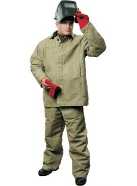 Костюм с притачным утеплителем из ватина (пл. 500 гр/м2) для проведения сварочных работ, состоит из куртки и брюк. Куртка с центральной потайной бортовой застежкой на пуговицы и карманами в боковых швах.