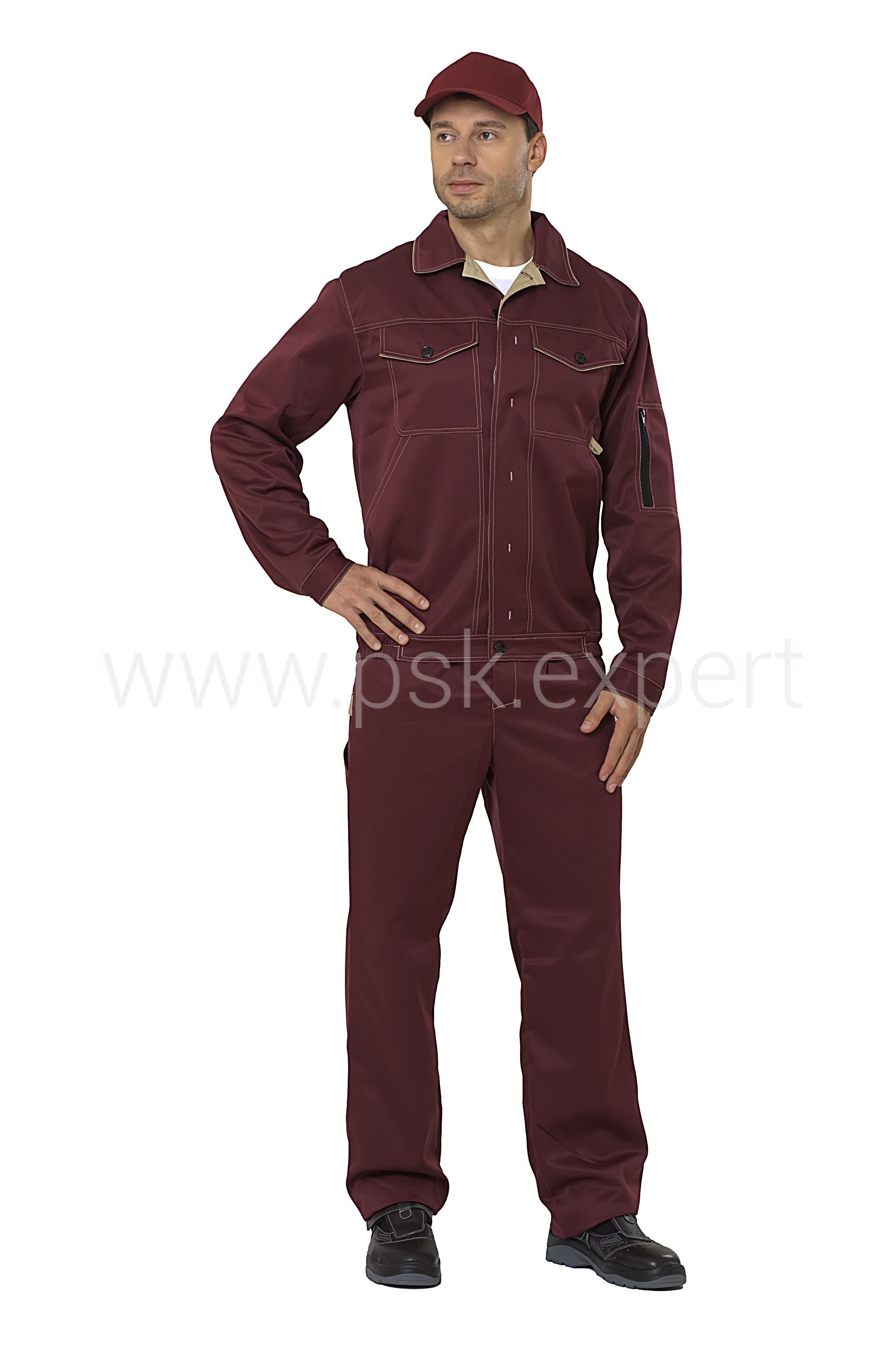 Костюм: куртка и брюки. Укороченная куртка с потайной застежкой на пуговицы, с двумя нагрудными карманами с клапанами и большими нижними накладными карманами. Кокетка спинки, подборта, нижний воротник и нижние детали клапанов выполнены из контрастной ткани. Пояс с эластичной тесьмой. Рукава с манжетами, застегивающимися на пуговицы. В верхней части левого рукава расположен карман с вертикальным входом с застежкой на молнию. Все отделочные строчки и закрепки по краю борта выполнены нитками в цвет отделки.