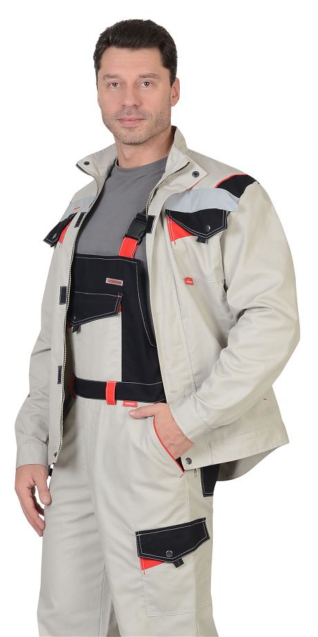 Куртка прямого силуэта; воротник стойка; с центральной застёжкой на молнию, накрытую ветрозащитным клапаном, застёгивающимся на кнопки и липучку; с подрезными бочками, с верхними и нижними карманами, с притачным поясом с фигурной линией низа со стороны спинки. Рукава с притачными манжетами на кнопках.