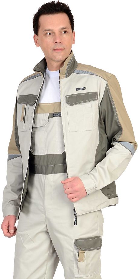 Куртка комбинированная трёхцветная, укороченная, прямого силуэта; с втачным воротником стойка; с центральной бортовой застёжкой на молнию; с подрезными бочками, с верхними накладными карманами с клапанами, с нижними прорезными карманами на "молнии". Объём куртки внизу регулируется при помощи хлястиков, пластиковой рамки и ленты "контакт". Рукава втачные, с притачными манжетами, ширина рукава внизу регулируется при помощи хлястиков и ленты "контакт".