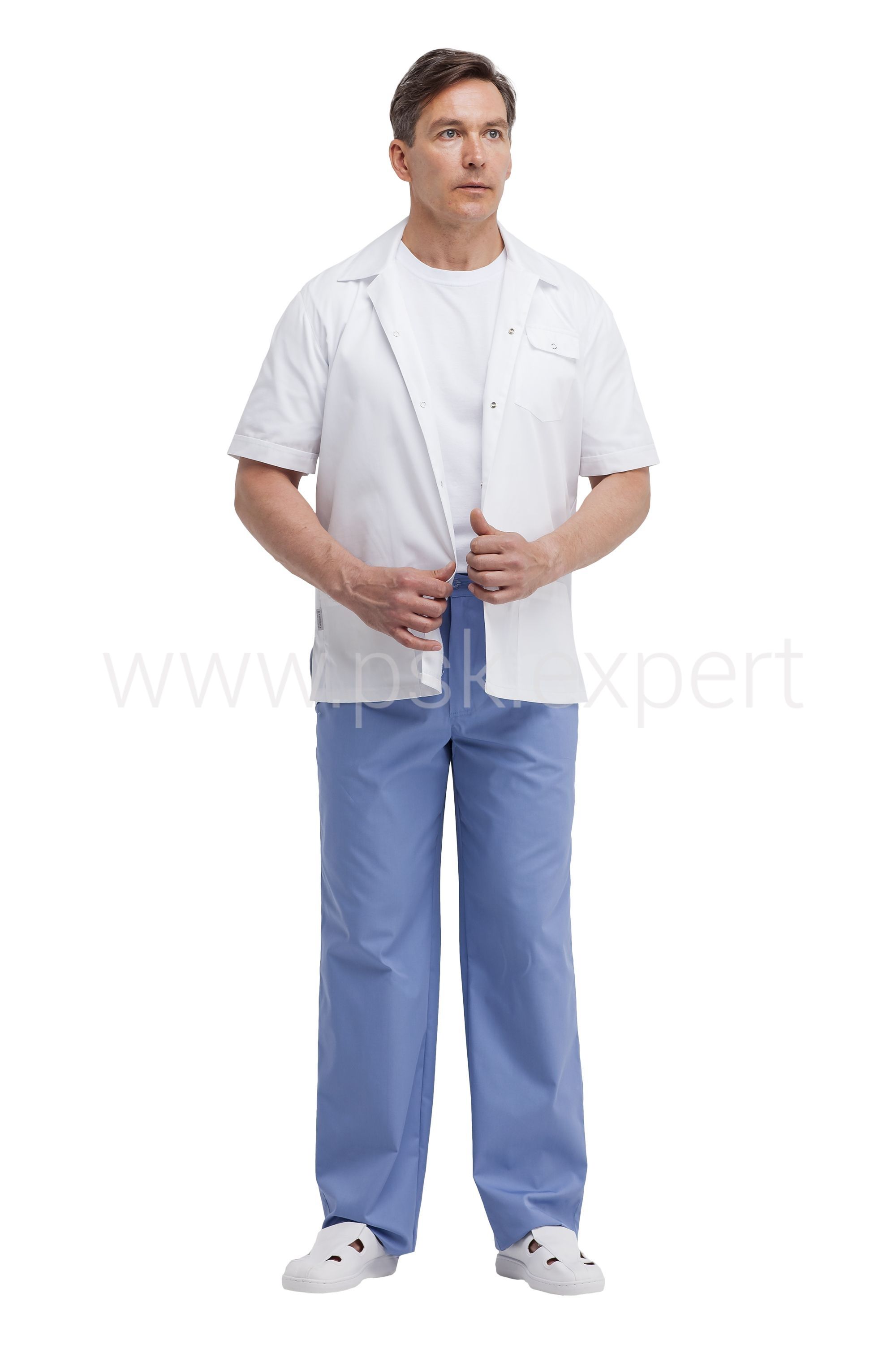 Куртка прямого силуэта с короткими рукавами, с отложным воротником и центральной застежкой на кнопки. На спинке складки, обеспечивающие свободу при движении. Два нижних кармана и один нагрудный карман с клапаном и с отделением для ручки.