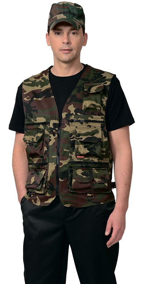 Тк. смесовая ВО, 210 г/кв.м. Застёжка спереди и 4 карманов на "молнию", 6 карманов с клапаном и "липучкой", полукольца, хлястики по талии. ТУ 8550-001-81391241-2008.