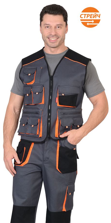 Жилет с застежкой на тесьму - "молния"; с верхними, средними и нижними многофункциональными объемными карманами с клапанами, с кантом из отделочной ткани. В жилете вшивается паты из ленты ранцевой с рефлектором 25/10 СВМ.Ткань основная: "Стрейч" 98% х/б 2% эластан, поверхностная плотность 250 г/м2. Цвет: темно серый.