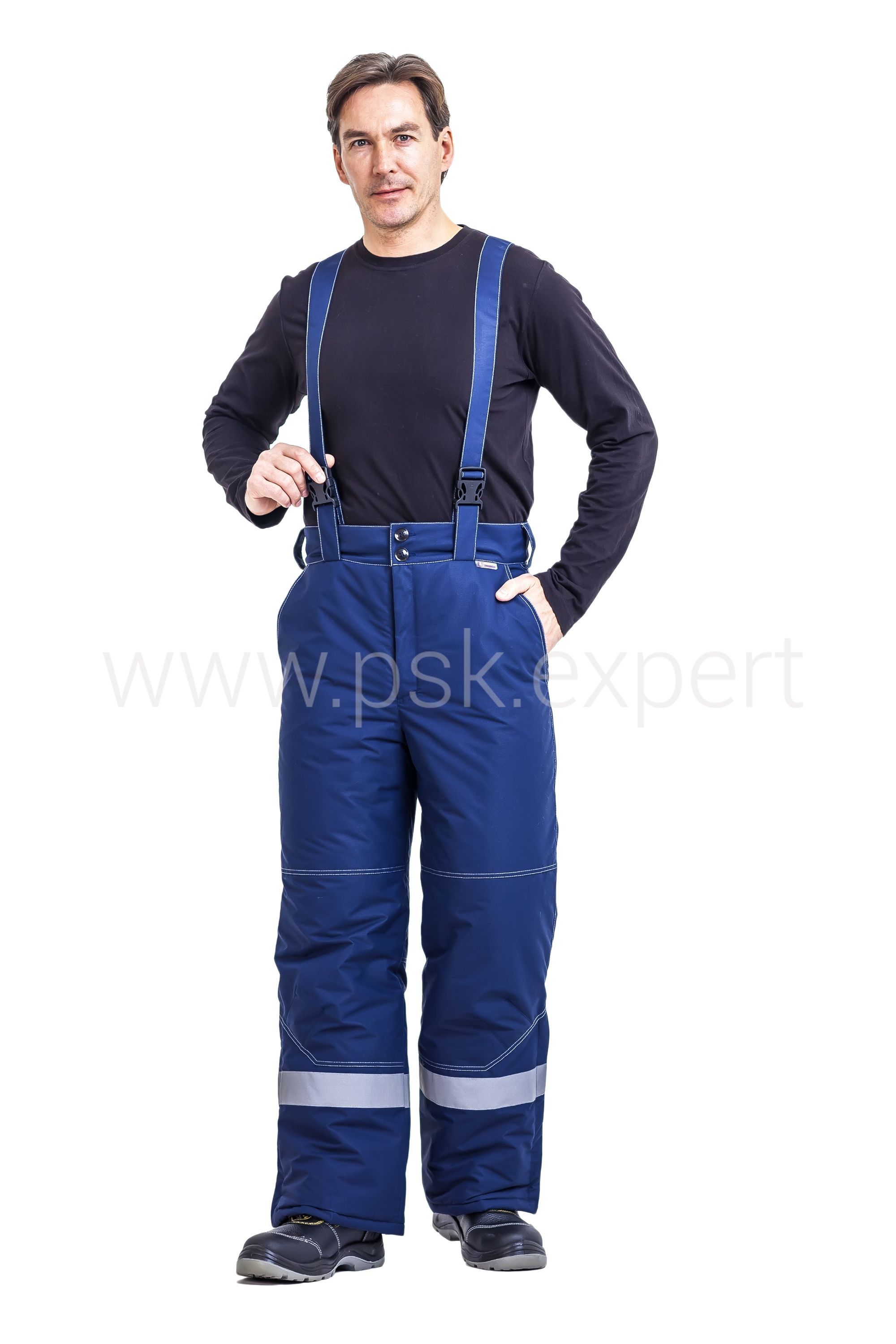 Брюки с широким поясом и шлевками для ремня. Утепленная флисом спинка пристегивается к задней части пояса молнией. Бретели с эластичной тесьмой и пристегиваются к передней части брюк фастексами. Застежка гульфик в среднем шве на молнию. Боковые внутренние карманы и один накладной карман на задней части брюк. Наколенники выпуклой формы обеспечивают комфорт при движении. Ширина брюк в низу регулируется при помощи молнии в боковых швах. Световозвращающая лента шириной 50 мм в нижней части брюк обеспечивает видимость работающего в любое время суток. Класс защиты: 2 (III климатический пояс).