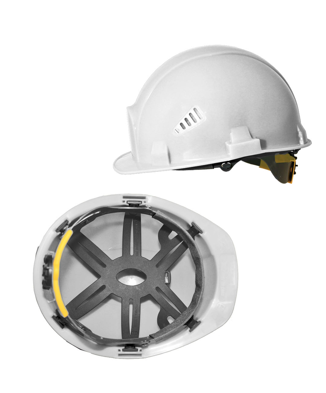 Корпус каски с вентиляционными отверстиями, пазами для крепления наушников противошумных и/или щитков защитных лицевых и водосточным желобком имеет суперлегкий вес, создает высокий уровень комфорта при длительном ношении каски;