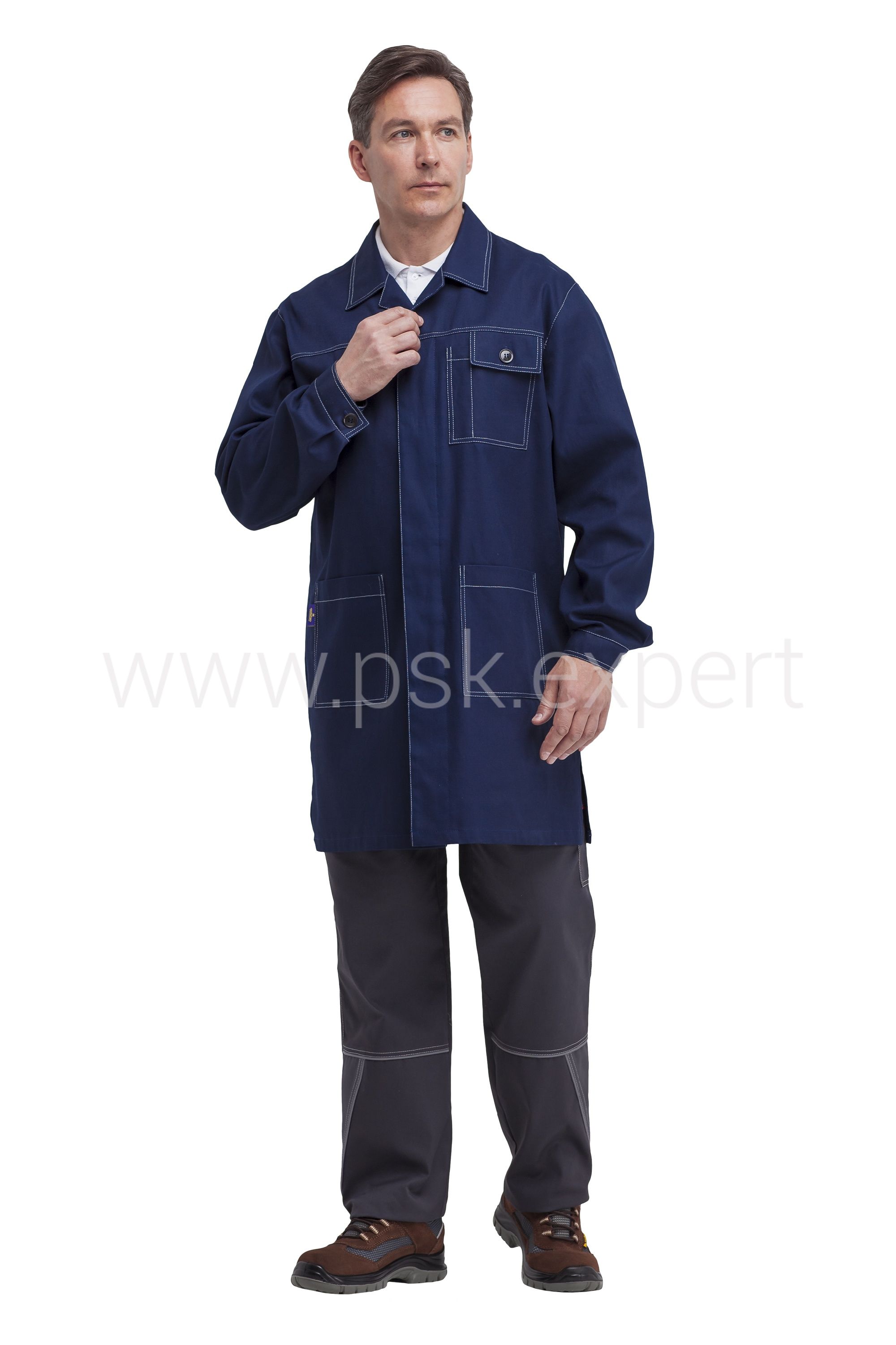 Спинка и полочки с кокетками. На левой полочке расположен нагрудный карман с отделением для ручки, с клапаном, застегивающимся на пуговицу. В нижней части полочек расположены накладные карманы. Спинка со средним швом. Все отделочные строчки выполнены светло-серыми нитками.