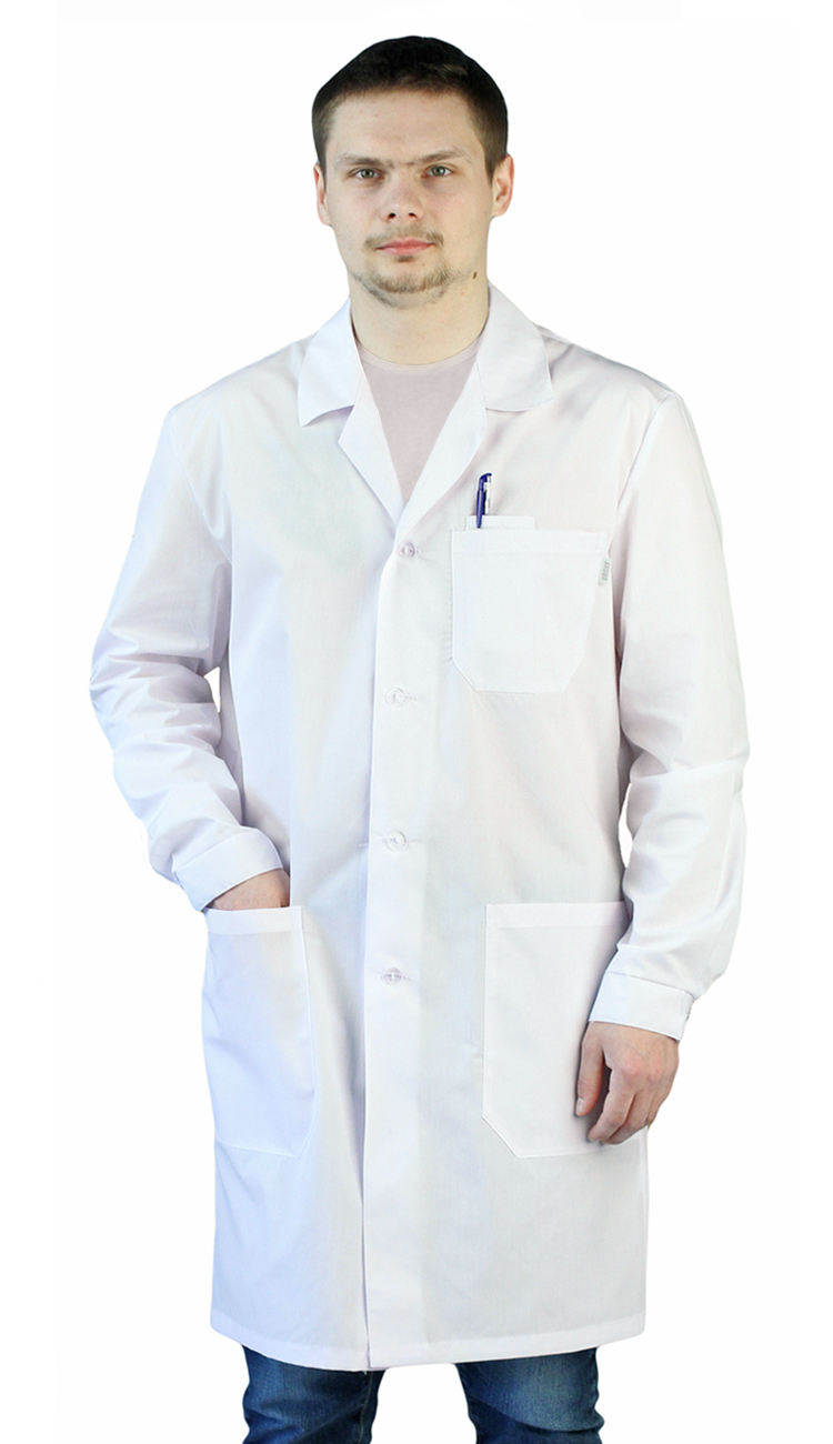 Халат с застежкой на пуговицы, с длинным руквом, объем по талии регулируется хлястиком.