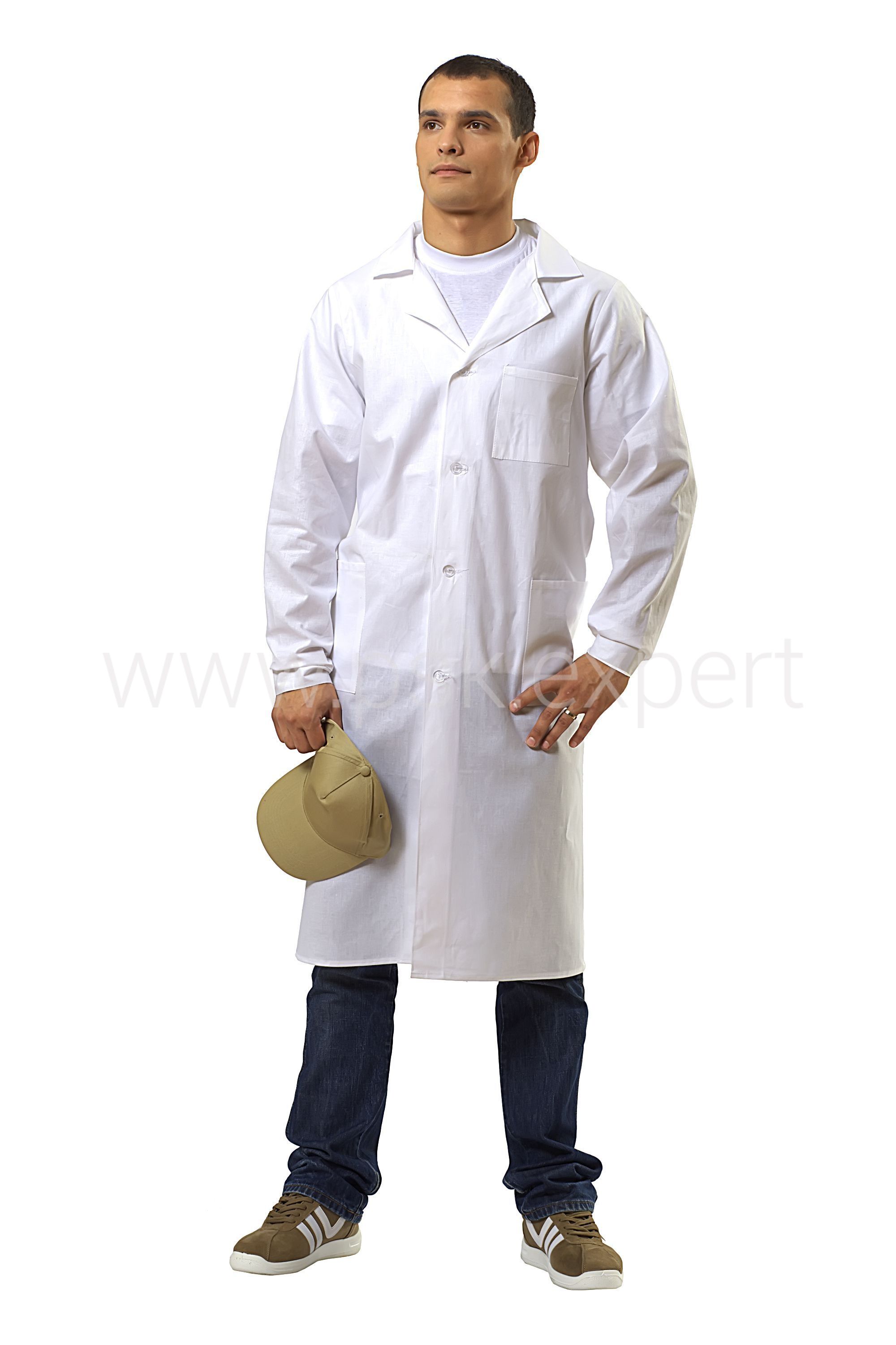 Халат прямого силуэта с центральной бортовой застежкой на пуговицы, с отложным классический воротником. Рукава с манжетами, застегивающимися на пуговицы. Один нагрудный карман и два накладных боковых кармана.