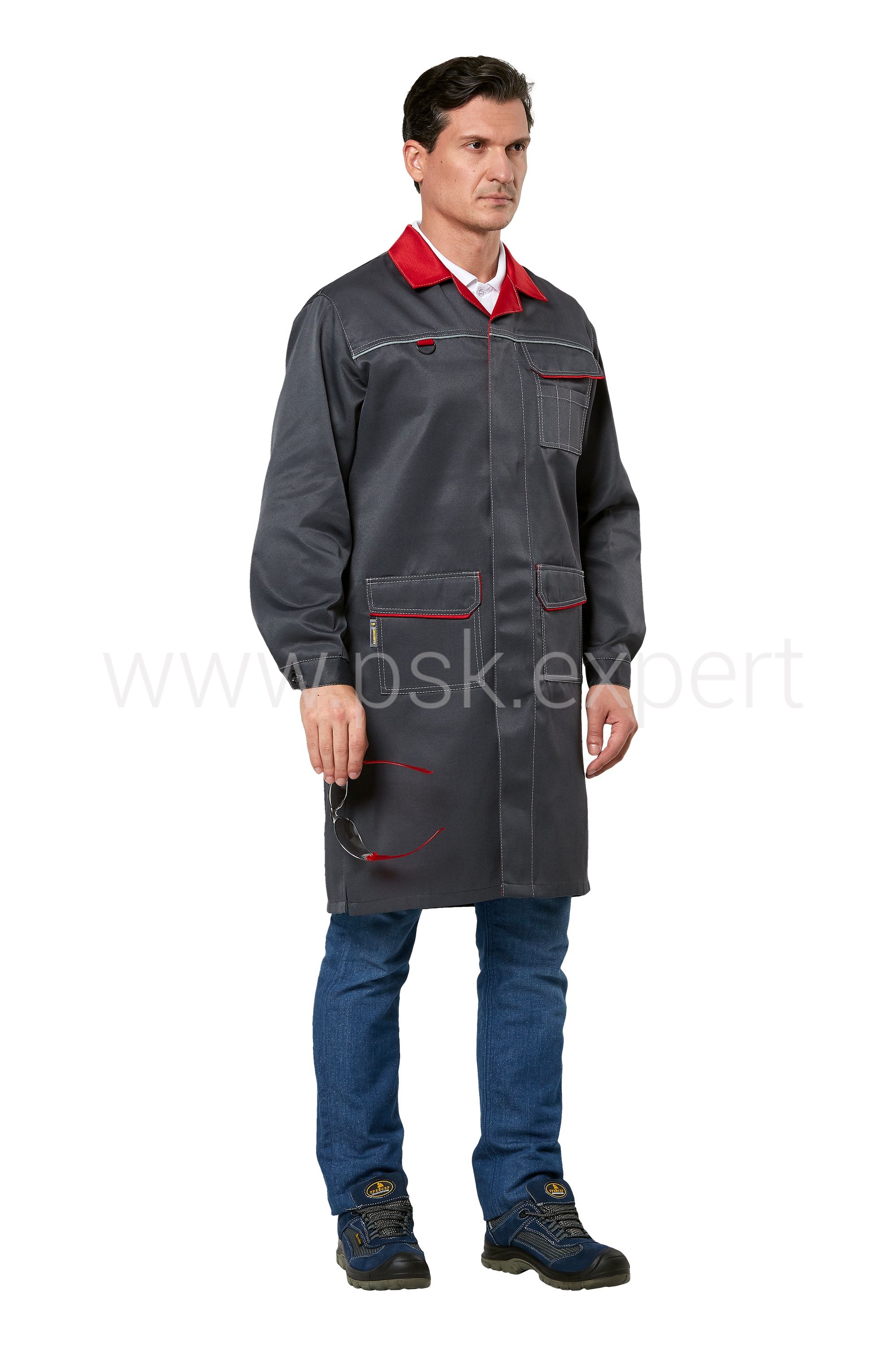 Халат прямого силуэта, с длинными рукавами с манжетами, застегивающимися на пуговицу, с отложным воротником. Центральная застежка потайная на пуговицы. В нижней части боковых швов разрезы. Два накладных кармана с клапаном, застегивающимся на контактную ленту. На левой полочке нагрудный карман с клапаном, застегивающимся на контактную ленту, с дополнительным малым карманом и отделениями для канцелярских принадлежностей. На правой полочке держатель с металлическим полукольцом для бейджа. В швах притачивания кокеток СВ кант. Спинка со средним швом. Воротник, подборта, нижние клапана карманов, держатель полукольца выполнены из отделочной ткани. Все отделочные строчки выполнены нитками контрастного цвета.