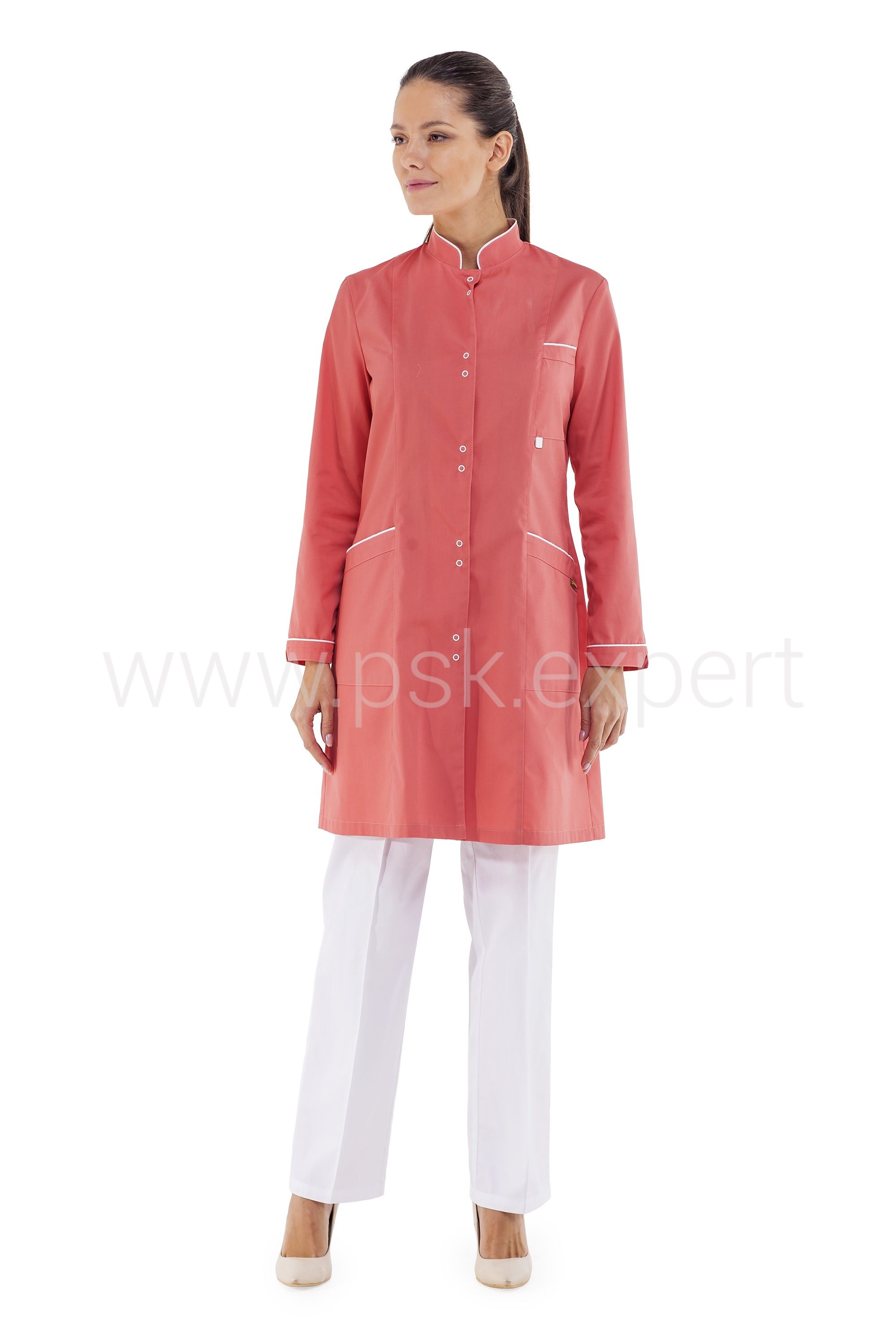 • Халат полуприлегающего силуэта, с  рельефами, с воротником-стойкой, с застежкой на кнопки. Два нижних кармана и один нагрудный карман с петлей для крепления бейджа. Длина халата до середины колена, что позволяет носить халат как отдельным предметом так и в комплекте с брюками. Отделка белым кантом по контуру стойки, карманам и низу рукавов.