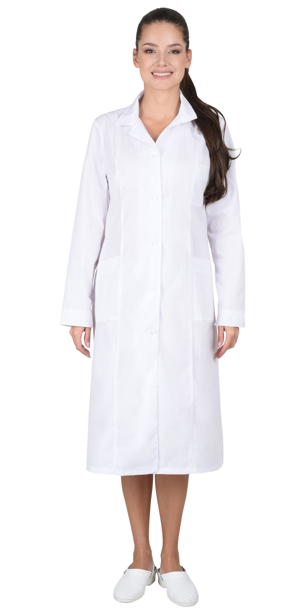 Классическая модель с нагрудным и двумя нижними накладными карманами, отложным воротником и длинными рукавами с манжетами. Ширина халата по линии талии регулируется хлястиком.
