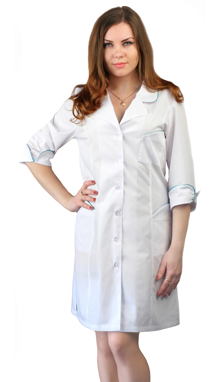 Халат прилегающего силуэта с центральной застежкой на пуговицы, с вертикальными рельфами, с фигурными карманами, с втачными рукавами 3/4. Карманы, воротник и манжеты с контрастной отделкой.