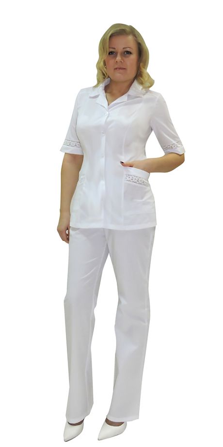 Тк. смесовая, 65%-п/э, 35%-х/б, 120 г/кв.м. Блуза полуприлегающего силуэта, с центральной бортовой застежкой на 5 петель и 5 пуговиц, с отложным воротником, с рельефными швами на полочках, с нижними карманами. Рукава короткие. Воротник, карманы, рукава с ажурной отделкой. Ширина блузы по талии регулируется хлястиком. Брюки прямые, с притачным поясом, частично стянутым эластичной лентой по боковым сторонам. ГОСТ 25294-2003