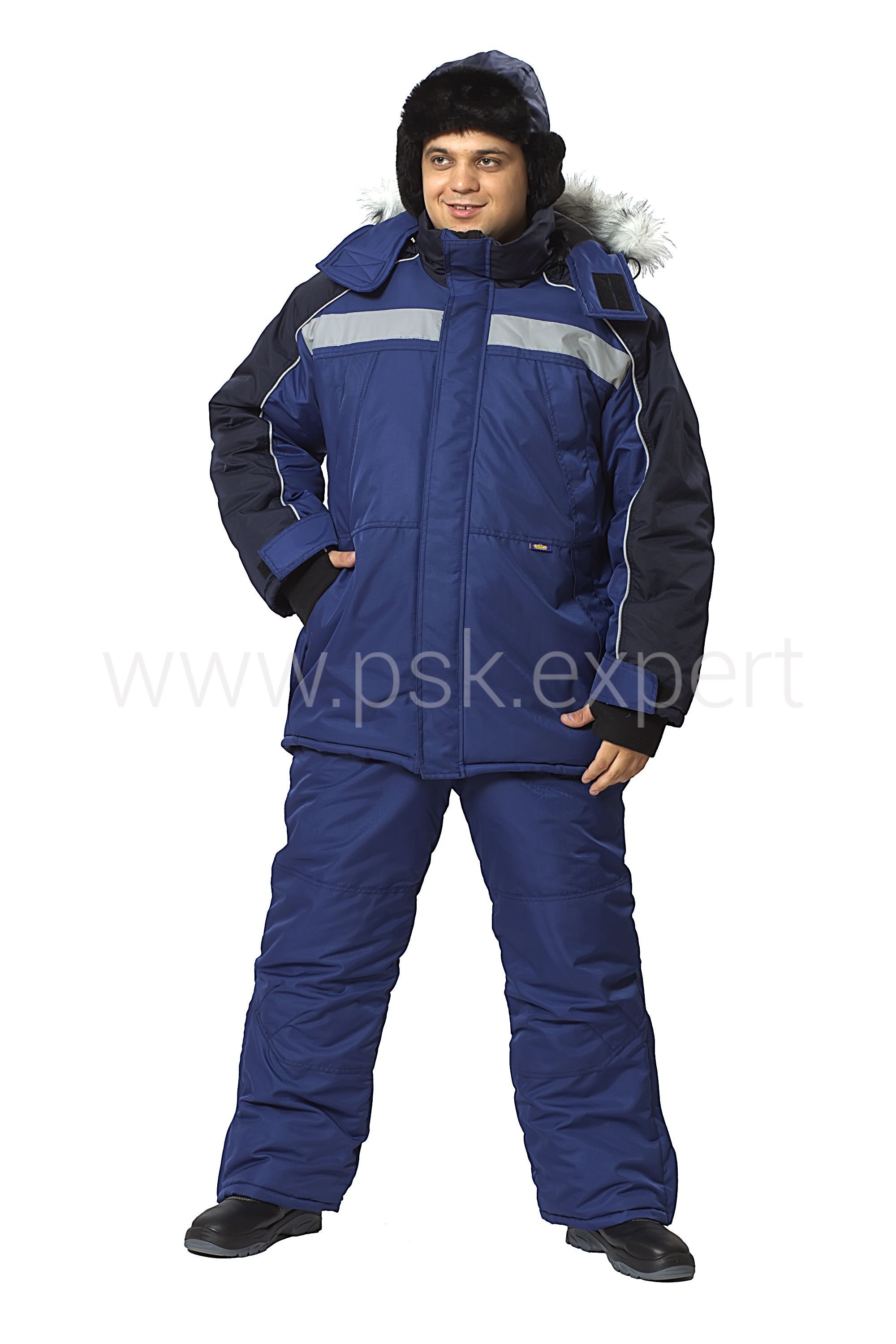 Костюм: куртка и брюки. Класс защиты: 2 (III климатический пояс). Куртка с центральной застежкой на молнию и контактную ленту, с ветрозащитной планкой, с воротником-стойкой. Пристегивающийся капюшон с регулировкой объема и опушкой из искусственного меха. Два боковых кармана внизу, карман на груди с застежкой на молнию. На подкладке - ветрозащиный пояс. Рукава с напульсниками с отверстиями для большого пальца. Брюки прямого силуэта с утепленной отстегивающейся спинкой и регулируемыми бретелями. Нижняя часть брюк регулируется по ширине с помощью молний, расположенных в боковых швах. Куртка с кантом и лентой СОП шириной 50 мм.