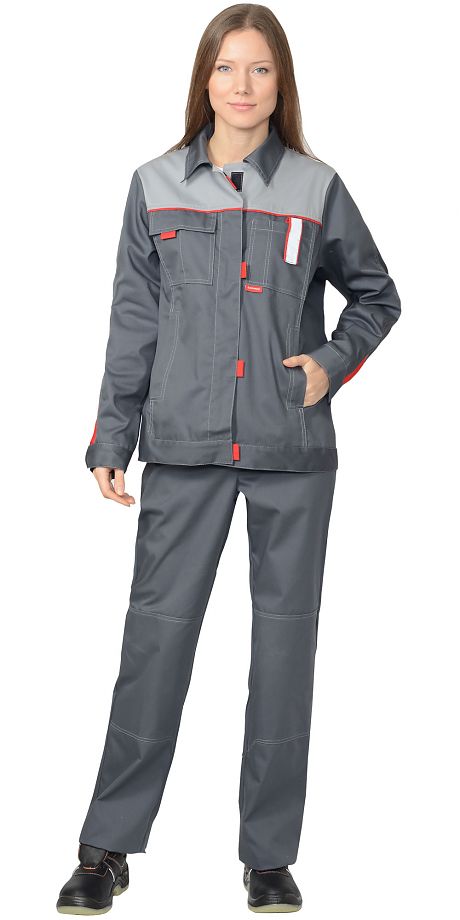 Куртка прямого силуэта; короткая; с центральной потайной застёжкой на тесьму-"молнию"; отложным воротником; нагрудными накладными карманами с клапаном; карманами в вертикальных швах.Брюки прямого покроя, с застёжкой гульфика на молнию, с притачным поясом, частично стянутым эластичной лентой, застёгивающимся на 1 пуговицу; с двумя боковыми карманами с фигурным входом; одним задним карманом и наколенниками.