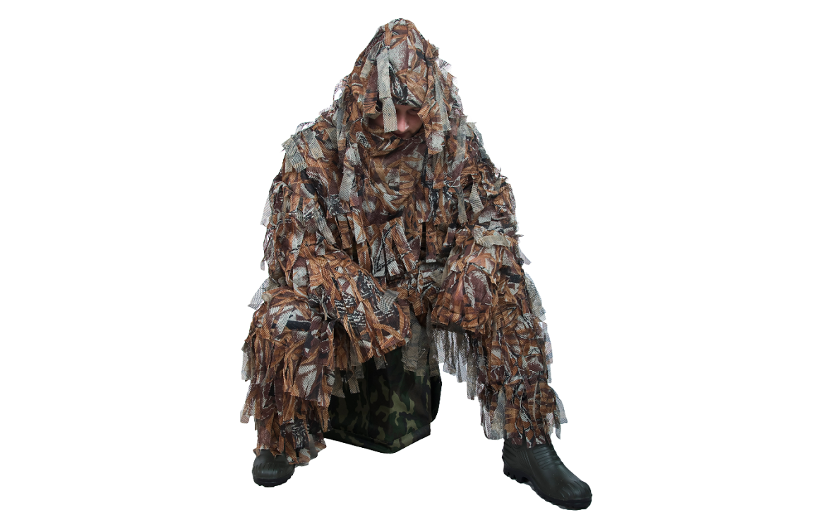 За счет крепежа маскировочного материала в одной точке на ветру и при движении, силуэт человека становится расплывчатым, создает эффект объемного камуфляжа, затрудняя распознавание и обнаружение охотника.