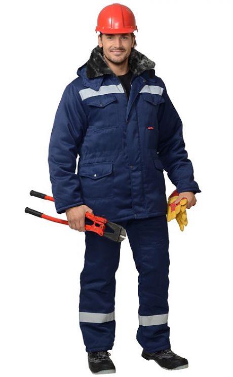 Ткань смесовая с ВО пропиткой, 80% п/э, 20% х/б, пл. 210 г/кв.м., подкладка 100% п/э, утеплитель синтепон, куртка 360 гр., брюки 240 гр., меховой воротник. ГОСТ Р 12.4.236-2011