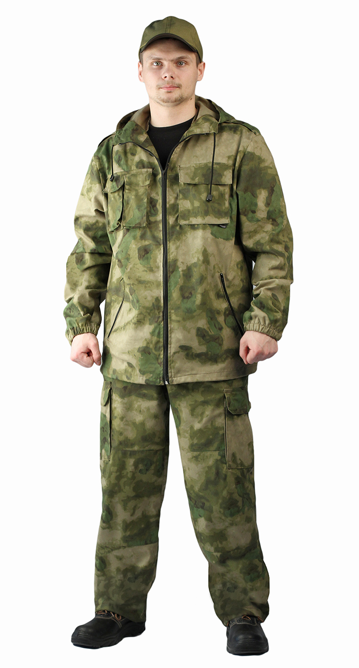 Камуфлированный универсальный летний костюм для охоты, рыбалки и активного отдыха . Состоит из удлинённой куртки с капюшоном и брюк.