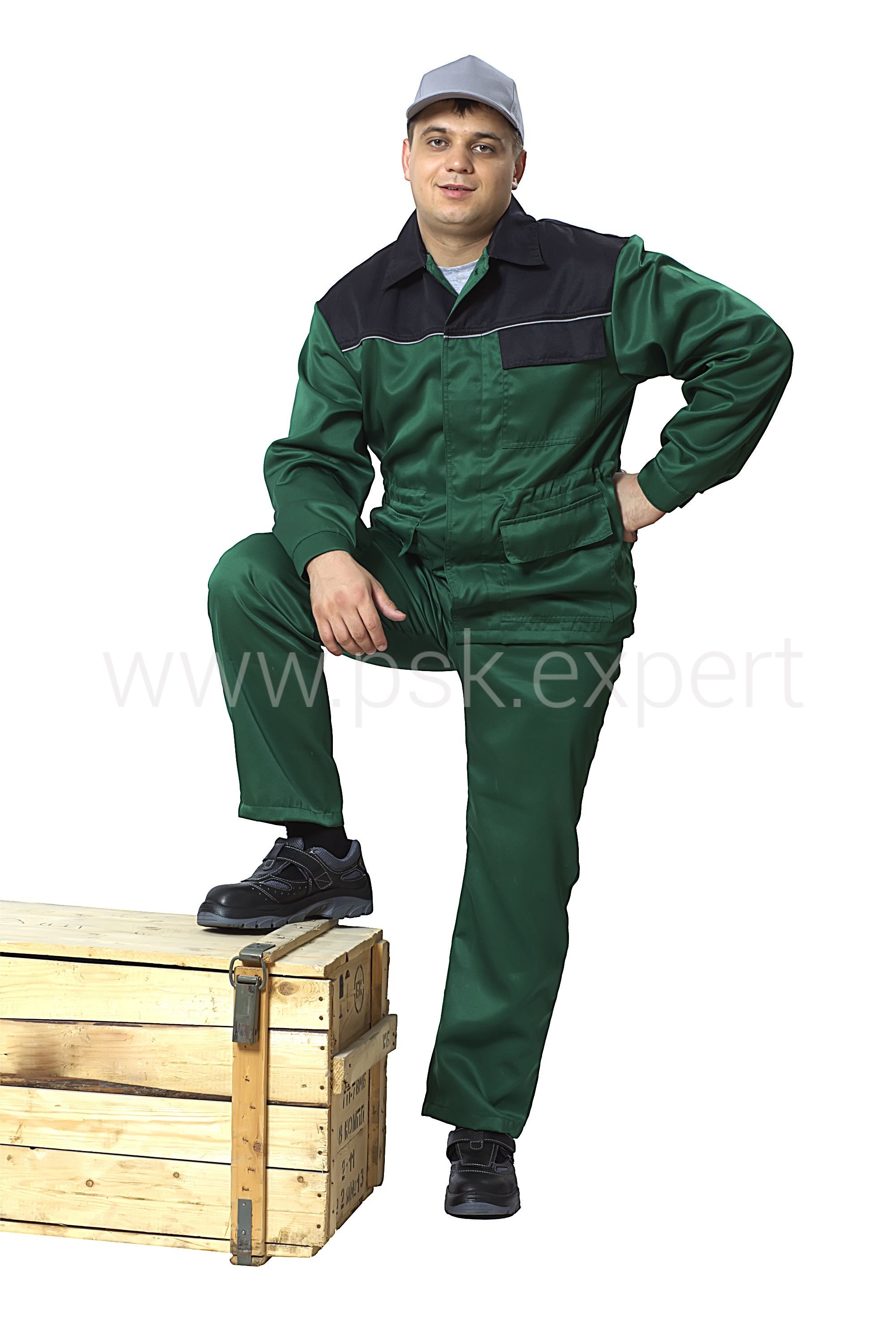 Костюм - куртка и брюки. Куртка с центральной потайной застежкой на пуговицы, одним нагрудным и двумя боковыми накладными карманами с клапаном. Объем по талии регулируется при помощи кулиски со шнуром. По швам притачивания кокеток расоложен светоотражающий кант, дополнительно на спинке светоотражающая полоса шириной 50мм. Брюки прямого силуэта с передней застежкой на молнию, шлевками под ремень, боковыми и задними карманами. Все детали отстрочены контрастной отделочной строчкой.