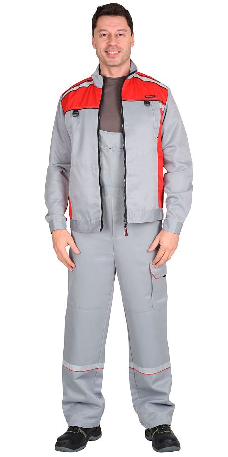 Куртка прямого силуэта, короткая, с воротником стойка, с центральной застёжкой на 1-замковую тесьму - "молнию", с подрезными бочками, с верхними и нижними карманами в швах, с притачным поясом регулирующимся по ширине при помощи хлястиков и кнопок. Рукава с манжетами на кнопках.Полукомбинезон с застёжкой гульфика и застёжкой в правом боковом шве на три петли и пуговицы, верхним накладным карманом и нижними внутренними боковыми карманами, с наколенниками, с накладным карманом на левом боковом шве с клапаном на кнопке с патой, с двумя задними и карманами для инструментов, по спинке вставлена резинка.