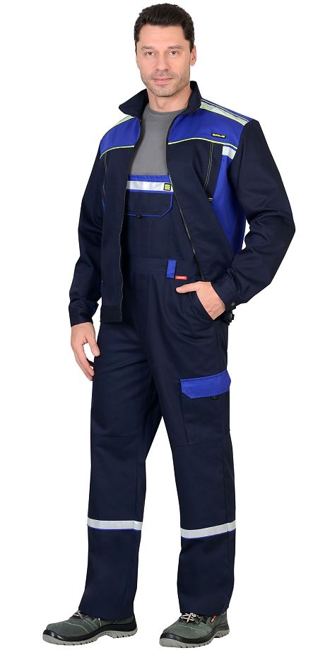 Куртка прямого силуэта, короткая, с воротником стойка, с центральной застёжкой на 1-замковую тесьму - "молнию", с подрезными бочками, с верхними и нижними карманами в швах, с притачным поясом регулирующимся по ширине при помощи хлястиков и кнопок. Рукава с манжетами на кнопках.Полукомбинезон с застёжкой гульфика и застёжкой в правом боковом шве на три петли и пуговицы, верхним накладным карманом и нижними внутренними боковыми карманами, с наколенниками, с накладным карманом на левом боковом шве с клапаном на кнопке с патой, с двумя задними и карманами для инструментов, по спинке вставлена резинка.