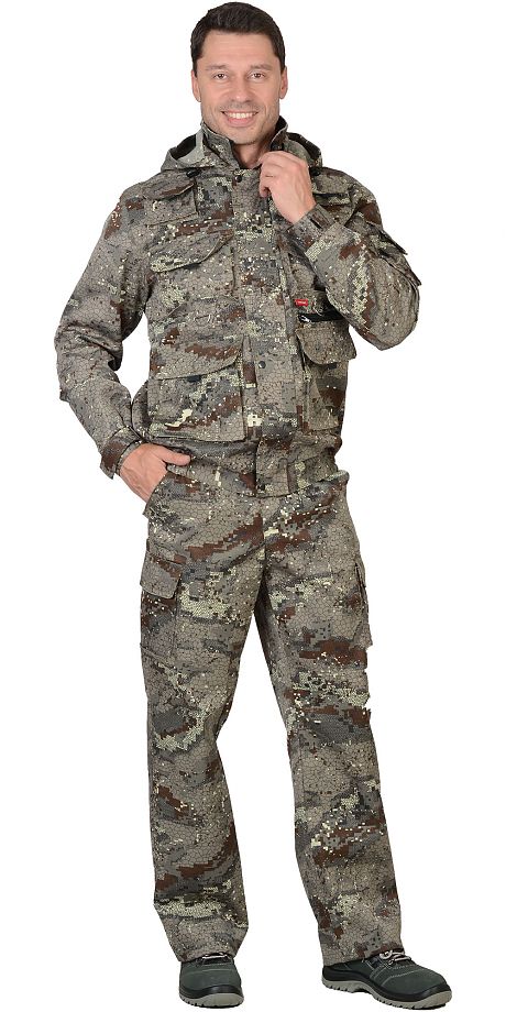Куртка короткая, с центральной застёжкой на молнию накрытой ветрозащитным клапаном, воротник стойка, пристёгивающимся капюшоном, различными многофункциональными накладными карманами с клапанами на «липучках». Рукава с манжетами и патой на «липучке». Низ куртки с притачным поясом стянутым резинкой.Брюки с притачным поясом, частично стянутым резинкой и застёгивающимся на пуговицу, застёжкой гульфика на молнию, с различными карманами. Низ брюк регулируется эластичным шнуром.Ткань: «CROWN-230» смесовая с ВО пропиткой: 80% п/э, 20 % х/б, пл. 230 г/м. ГОСТ 12.4.280-2014