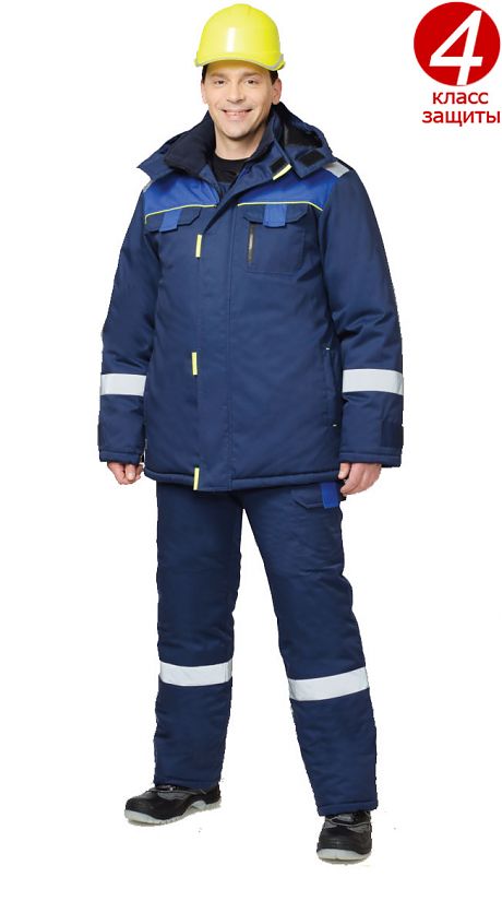 Костюм зимний предназначен для особого климатического пояса 4 класса защиты, состоит из куртки и полукомбинезона. В костюме предусмотрены светоотражающие детали для обеспечения видимости работающего в тёмное время суток.