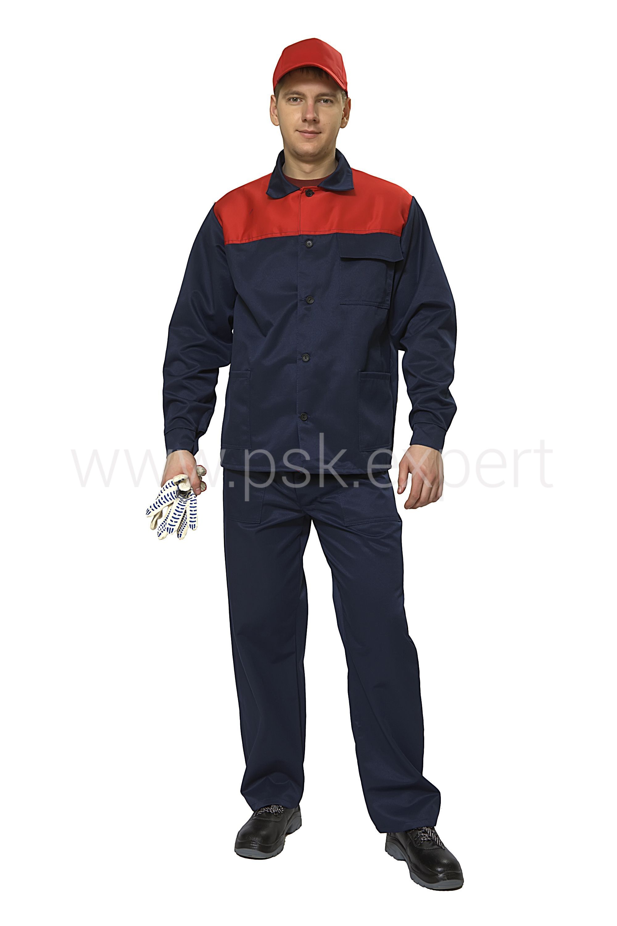 Костюм: удлиненная куртка и брюки. Куртка с центральной застежкой на пуговицы. Кокетки полочек и спинки из отделочной ткани. Один нагрудный карман с клапаном и два нижних накладных кармана. Рукава с манжетами, застегивающимися на пуговицы. Брюки с поясом со шлевками, с центральной застежкой на пуговицы, с накладными боковыми карманами.