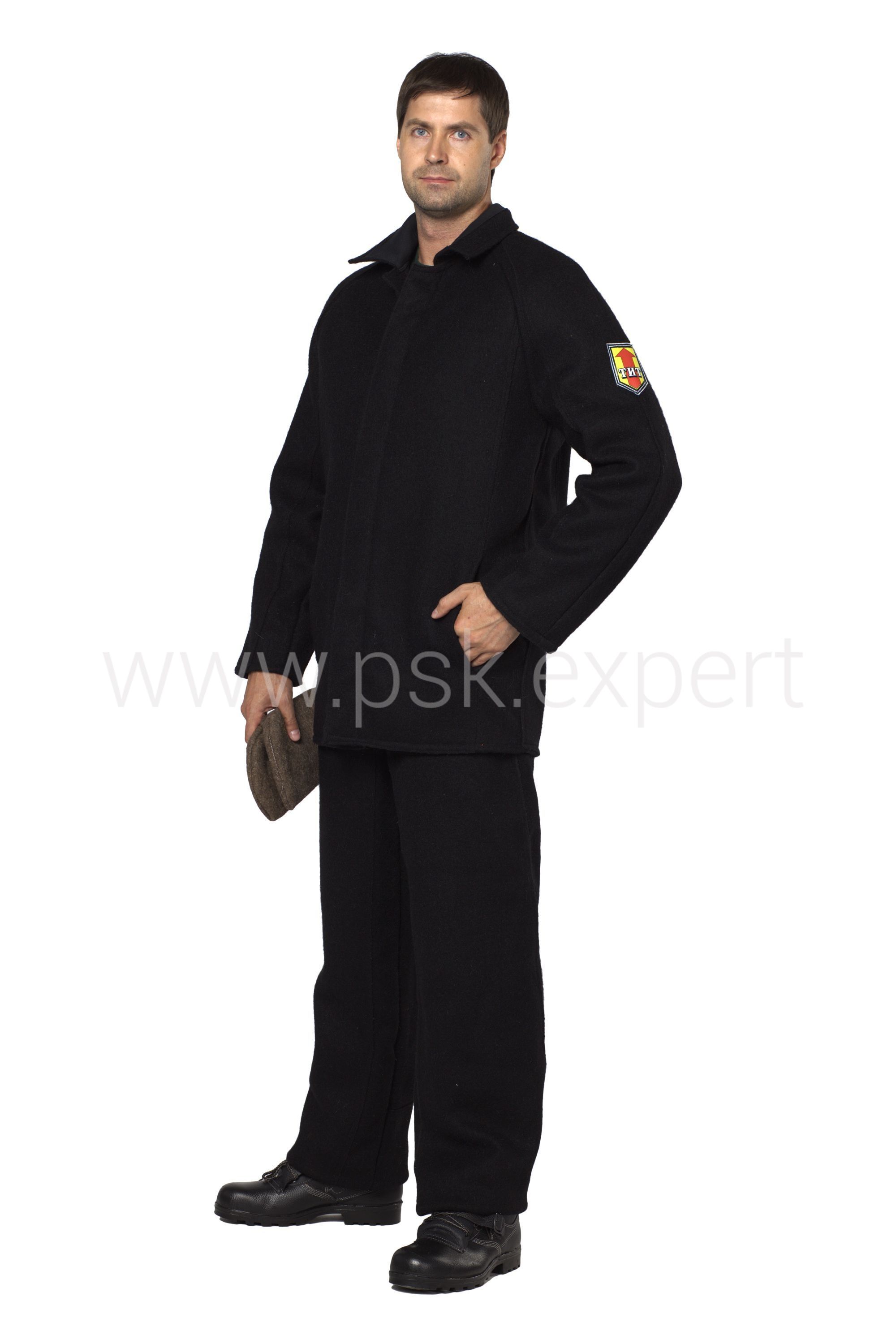 Костюм – куртка и брюки. Куртка на подкладке с центральной бортовой потайной застежкой и внутренними карманами. Брюки свободного прямого покроя, с центральной застежкой на молнию. Защитные накладки из сукна на полочках куртки, на рукавах, а также небольшие накладки на спинке с боков. Имеются накладки на передних половинках брюк, на задних - по низу и вдоль бокового шва.