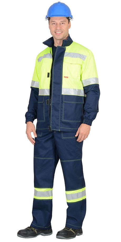 Куртка прямого силуэта: с центральной застёжкой на тесьму - "молнию" и ветрозащитной планкой, застегивающийся на потайную липучку, воротником - стойка, верхним накладным карманом со складкой и клапаном застегивающийся на потайную липучку, с нижними накладными карманами с клапанами застегивающиеся на потайную липучку. Рукава втачные, с притачным манжетам частично стянутый на резинку ткацкую. В куртке настрачивается Лента светоотражающая 50 мм. YSL-201-35 х/б для обозначения сигнальной видимости.Ткань верха: "Орион" смесовая с ВО пропиткой, состав: 65% п/э, 35 % х/б; пл. 215 г/м2 ГОСТ 12.4.280-2014