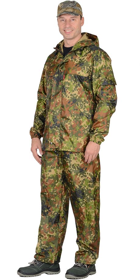 Тк. "Оксфорд", 100% п/э. Куртка с капюшоном со шнуром, застёжкой на "молнию", карманами, шнуром внизу. Пояс и низ брюк, низ рукавов с резинкой. ТУ 8550-001-81391241-2008.