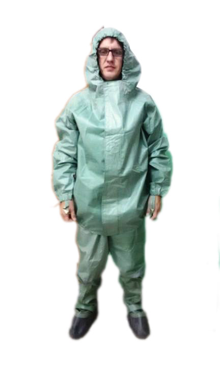 Изготовлен из ткани БЦК. Морозостойкая, рабочий диапазон температур (- 40, +50°С), устойчива к действию масел, кислот, бензина. Костюм состоит из куртки, застегивающейся на букли c ветрозащитной планкой на липе) с капюшоном и п/комбинезона с приклеенными галошами.