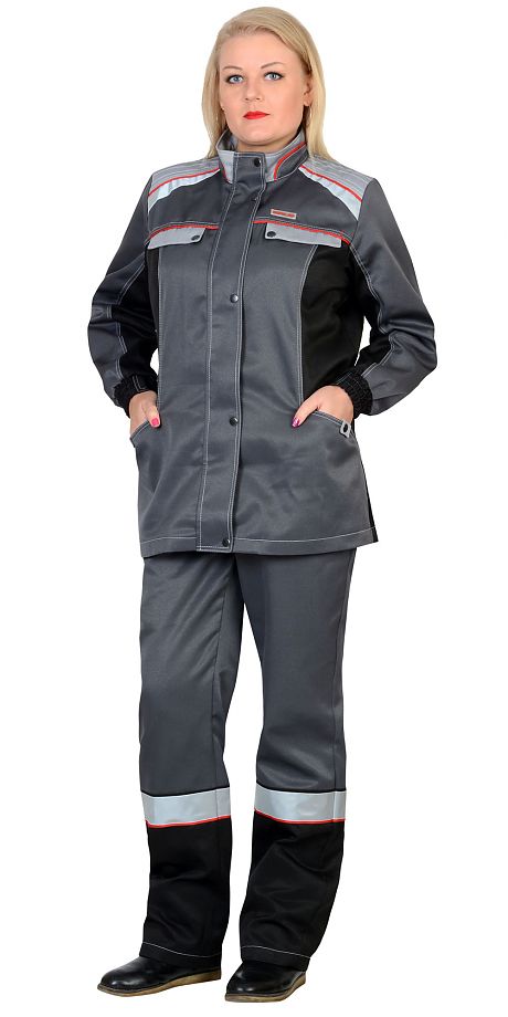 Куртка удлиненная; прямого силуэта, с центральной застежкой на молнию, светрозащитной планкой ,застегивающуюся на кнопки.Брюки прямого покроя, с застёжкой спереди на молнию, с притачным поясом, частично стянутым эластичной лентой и застёгивающимся на 1 пуговицу; с 5 шлевками; с двумя боковыми карманами с наклонным входом, с двумя задними карманами.