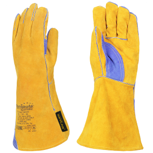 Перчатки изготовлены из воловьего спилка высочайшего качества (класс А+) толщиной 1,4 мм. Уникальный крой исключает швы в зонах сгиба пальцев, а у основания средних пальцев размещена кожаная вставка для повышения износостойкости. Тыльная сторона выполнена из цельного лоскута спилка.