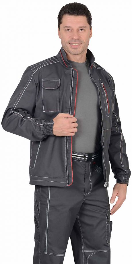 • Куртка короткая, воротник стойка; с центральной застежкой на тесьму "молнию"; с внутренней подпланкой; с верхним прорезным карманом на тесьму "молнию" на левой полочке, и с верхним накладным полуобъемным карманом с фигурным клапаном застегивающийся на потайную липучку на правой полочке; с нижними прорезными карманами "листочки", притачной обтачкой низа куртки и манжетами, манжеты частично стянуты резинкой. В куртку предусмотрен СВ кант для обозначения сигнальной видимости
