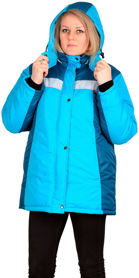 Куртка женская, прямого силуэта, с притачной утеплённой подкладкой, с центральной бортовой застёжкой на двух замковую тракторную тесьму "молния" и внешним ветрозащитным клапаном с 5-ю кнопками, с воротником "стойка" и съёмным утеплённым капюшоном; с боковыми карманами в рельефных швах.Ткань: "Дюспа", состав: 100% п/эТкань подкладочная: "Таффета", состав: 100 % - п/эУтеплитель: Синтепон, 120 г/м2 - 3 слоя (итого 360 г/м2)