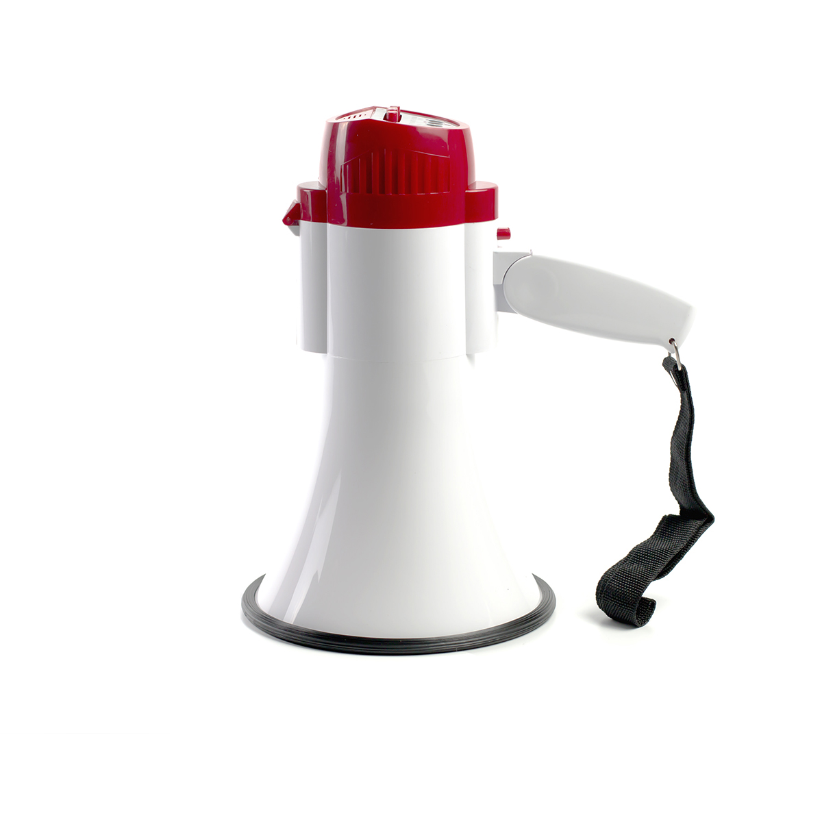 Высококачественный ABS пластик. Стильный, яркий, призывающий бело-красный глянцевый корпус. Ручной мегафон громкоговоритель с записью, встроенной сиреной. Дополнительно может быть укомплектован Li аккумулятором (см. модель MG-206RUL) Складная ручка обеспечивает компактность данной модели. Характеристики: Мощность 15 Ватт, (20 Ватт - макс) - слышимость до 400 метров