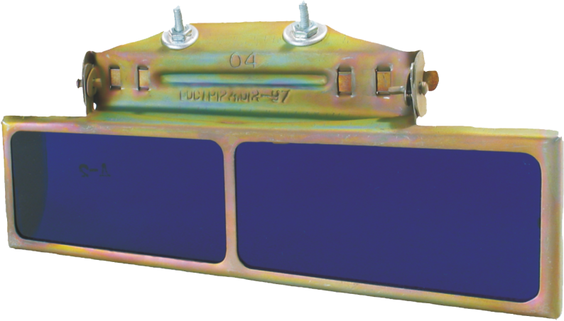 Очки козырьковые с минеральными защитными стеклами-светофильтрами в жестком металлическом стеклодержателе с поворотно-фиксирующим устройством и кронштейном для крепления на защитный головной убор или лицевой щиток.