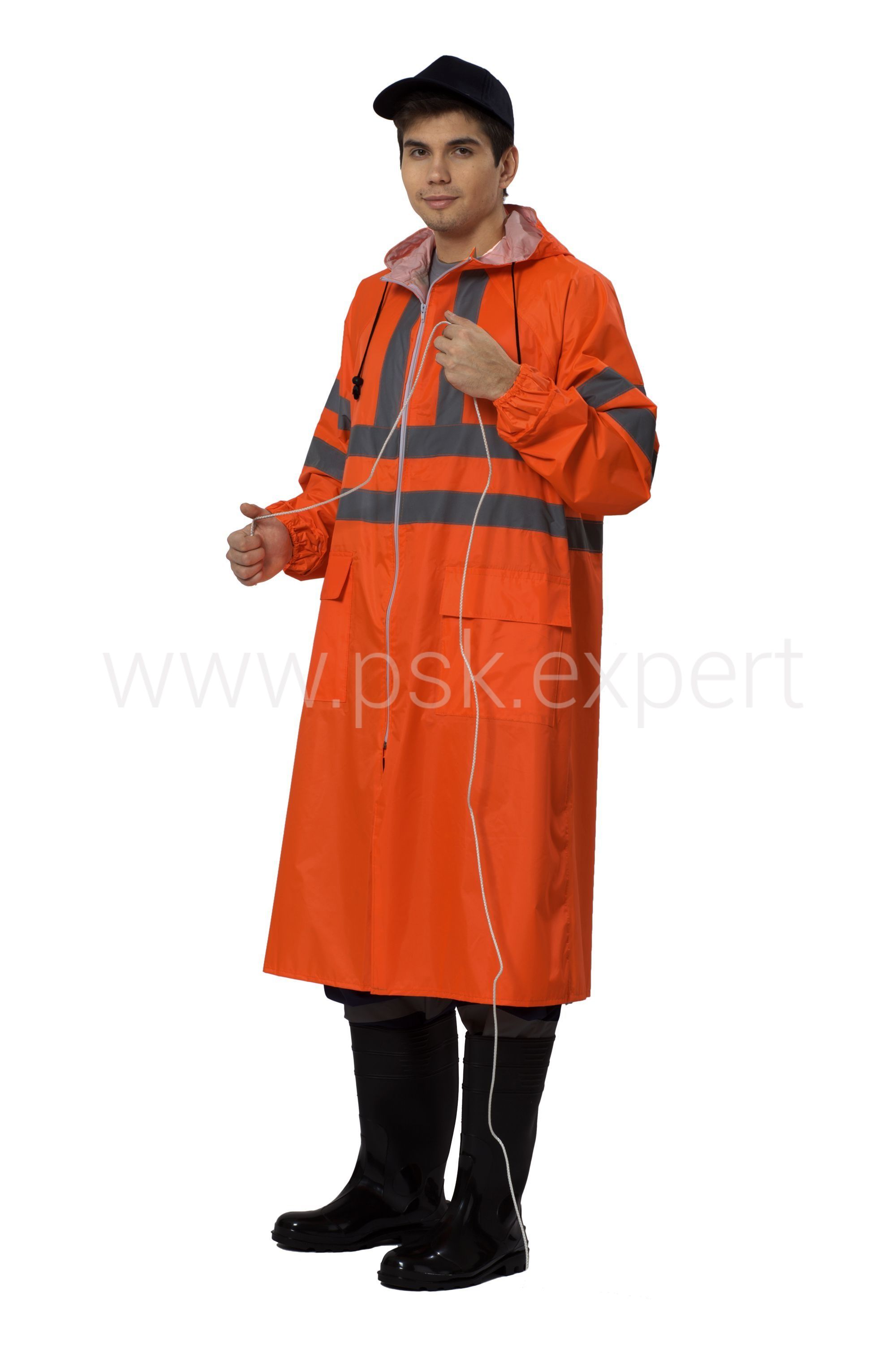 Плащ с центральной застежкой на молнию и внутренней ветрозащитной планкой, с капюшоном, с двумя накладными карманами с клапанами, с манжетами на рукавах из эластичной тесьмы. Для обеспечения повышенной видимости, плащ имеет четыре светоотражающие полосы (СОП, класс 2) шириной 50мм. : две СОП проложены горизонтально вокруг торса и две СОП проложены вертикально от плеча до уровня горизонтальных СОП. Для создания воздухообмена во время работы, в плаще имеются вентиляционные отверстия на уровне подмышечных впадин. Объем капюшона регулируется при помощи специального шнура-фиксатора. Изделие выполнено из синтетического водоупорного материала: 100% полиэфир с внутренним ПВХ покрытием. Все швы изделия проклеены изнутри и герметичны. Ткань экологична и соответствует европейскому стандарту по содержанию вредных веществ EN 71 PART3. Рекомендуется для рыболовецких хозяйств, портовых рабочих, строителей, дорожных и муниципальных служб.